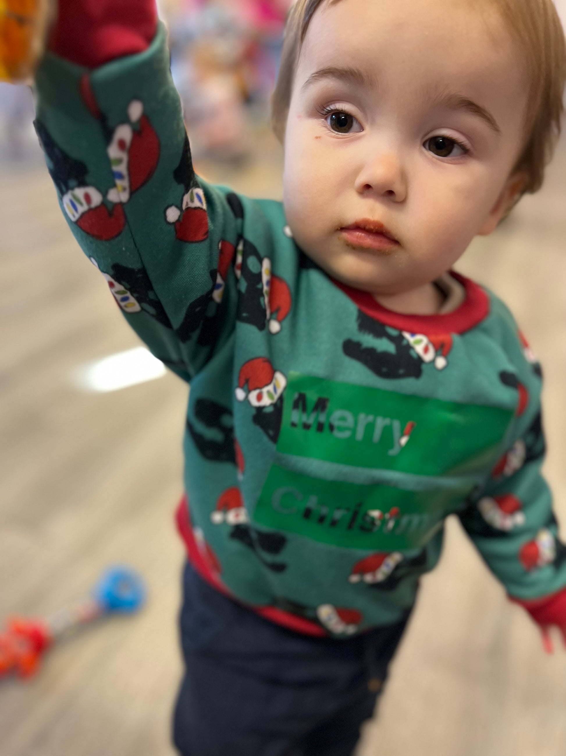Dino Christmas hat print unisex children's loopback jersey sweatshirt with vinyl Merry Christmas logo.
